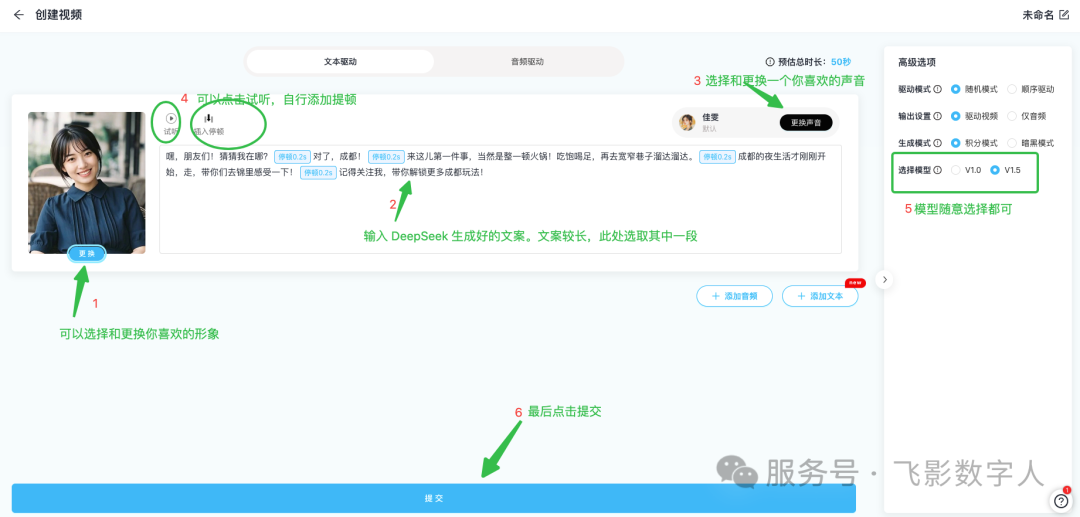下面这个视频没有花一分钱,没有请模特、没有专业相机拍摄、没有配音演员、没有后期剪辑制作,不到10分钟就制作完成了。你敢信? (本视频由 AI 生成) 不需要复杂的技术,只需一台手机或电脑,DeepSeek + 飞影数字人这2个强大的 AI 工具,没有花一分钱,0成本就制作完成了,真正体验了“一键生成视频”。 下面附上详细教程,跟着来操作。(文末有福利) Step 1 让 DeepSeek 来自动生成视频文案(免费) 首先,打开 DeepSeek 官网:https://chat.deepseek.com/ 然后,输入提示词。要点:1)给人设 2)文案的主题和应用场景 3)文案风格 4)文案内容的长度、格式等其他要求 再继续,可以根据输出的结果进行多次调试,直至可以复制可用或者在此基础上,手动做微调即可。 以文章开头视频的内容生成为例子,只做了1次调整就基本可用。 - 提示词1:我是一个短视频的旅行博主,是个快乐女青年。目前在成都旅行,计划分享一下见闻。请帮我生成一下文案脚本,用于制作短视频。要求:口语化、简洁有趣