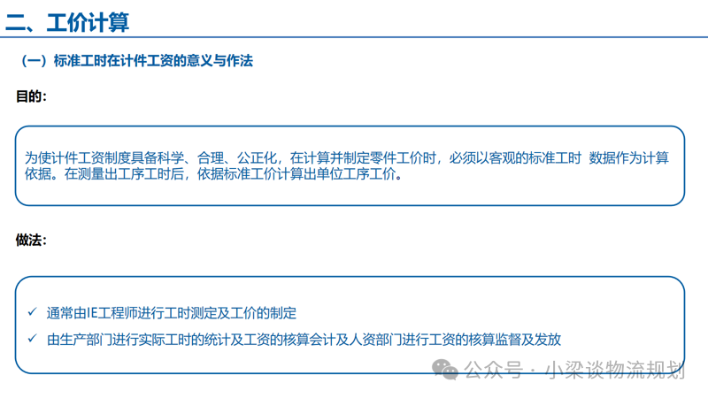 • 若标准工时为0.5小时/件,小时工资为20元,则工价=10元/件。工人日产量20件,日收入=200元,与企业预算匹配。