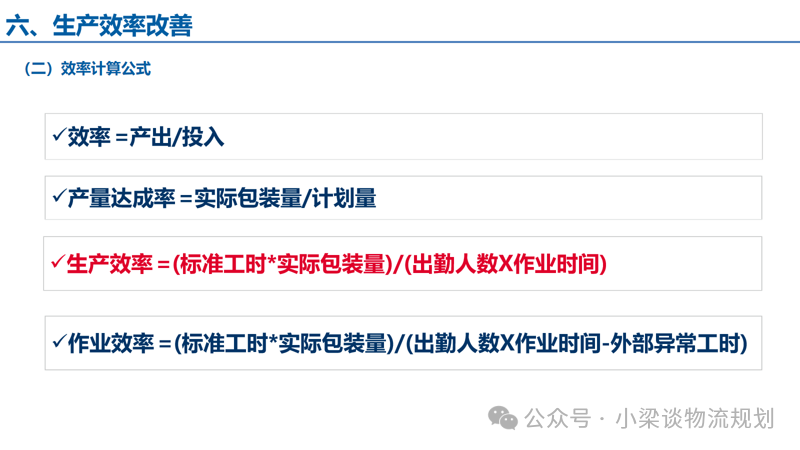 • 生产效率 = (标准工时 × 实际产量) / 实际作业时间 × 100%;