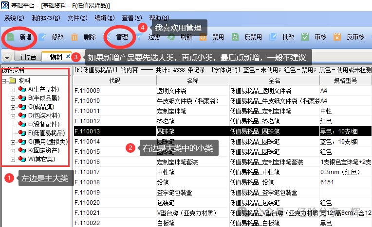 新增产品信息,要先选择左边的大类,再点右边的小类,再点新增,一般不建议这样做,这样很容易录错产品信息的归类,除非你很了解系统的录入分类和财务归类。我个人建议用管理功能来录信息。