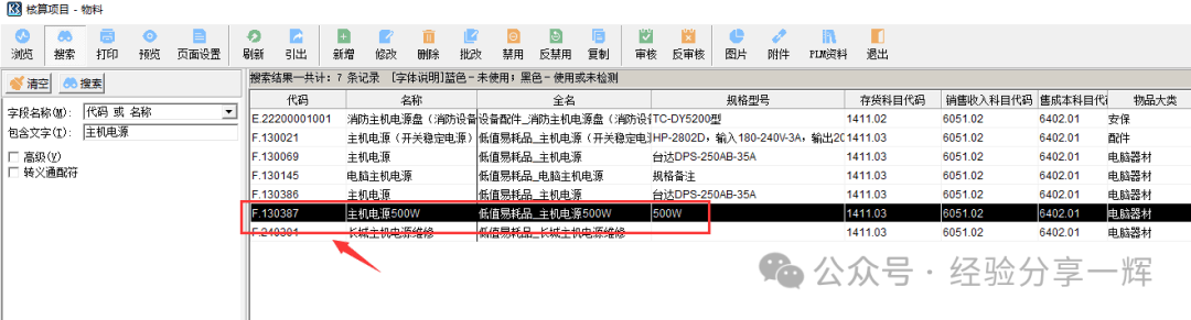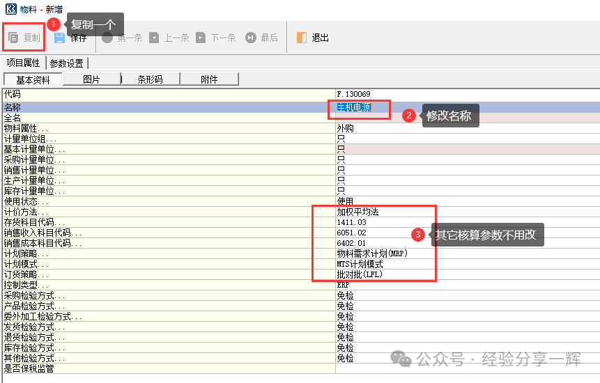 我们在这里可以看到,产品代码是(F.130)开头,物品的(大类)和(小类),产品(存货科目),(收入),(成本),的归类等信息,如果我们自己新增,不了解物品的核算归类,很容易搞错,到时会影响后面的财务报表。 所以我们最好是找到同类产品,双击进去,(复制)一个同类产品,修改名称,修改一些你自己知道的参数,一些不了解的参数,不用改,和同类产品一样就好。