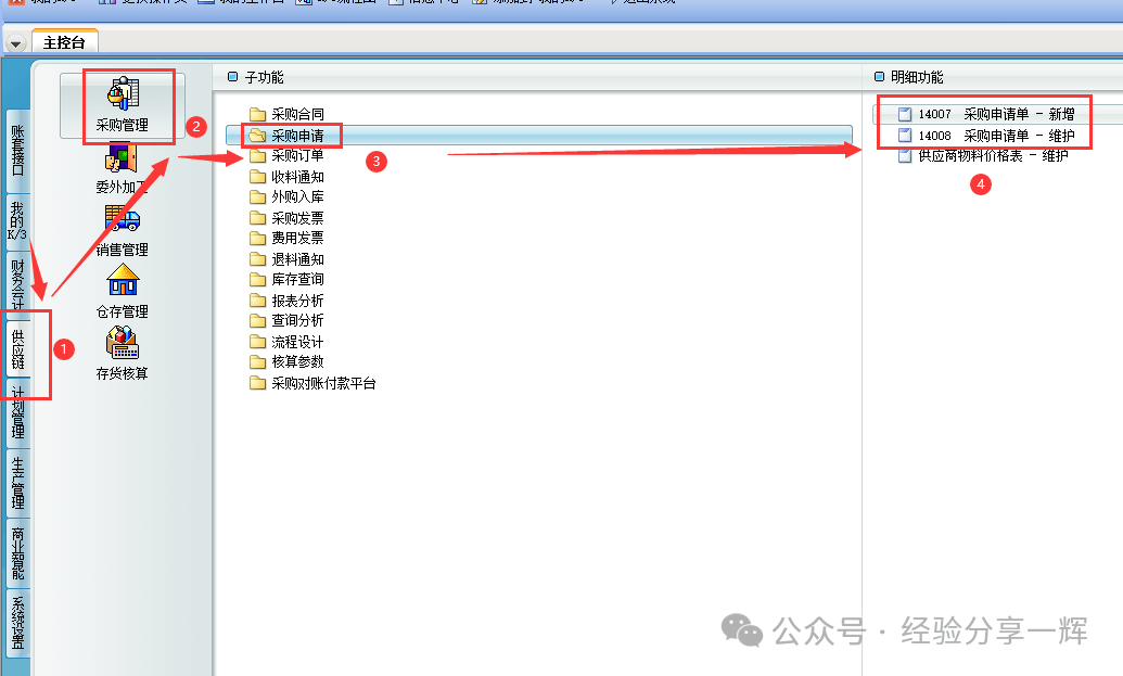第二、填写(采购申请单) 在(主控台)——(供应链)——(采购管理)——(采购申请)——(采购申请单-新增/维护)