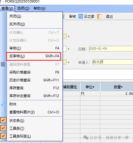 注意:如果要修改已(审核)的单,要先把单据(反审核),才能修改。在上面查看菜单里,有个(反审核)。