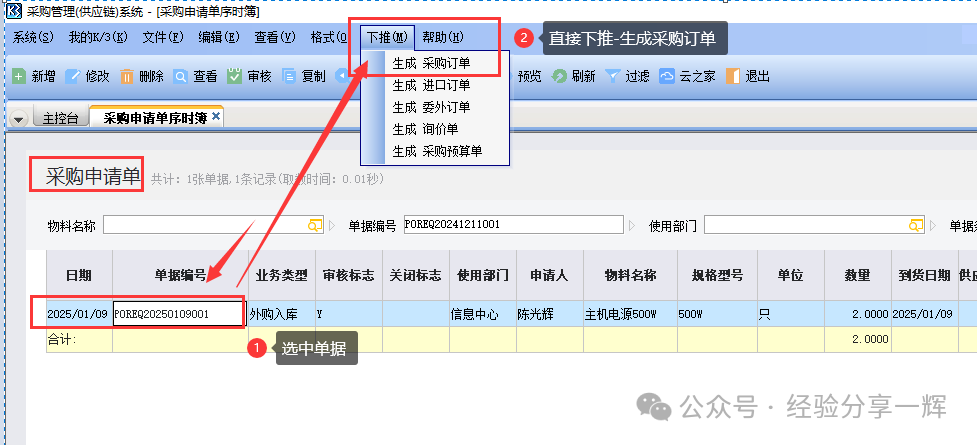 第三,从(采购申请单)到(采购订单) 我们先讲最简单的方法,在(采购申请单-维护)介面,选中订单,按上面的(下推--生成采购订单)。