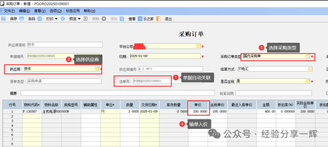 关联采购申请单后,还要填写几个关键选键选项,供应商选择(京东),选择采购类型(国内买的选国内采购),填写价格(200),有黄色的为必填项。
