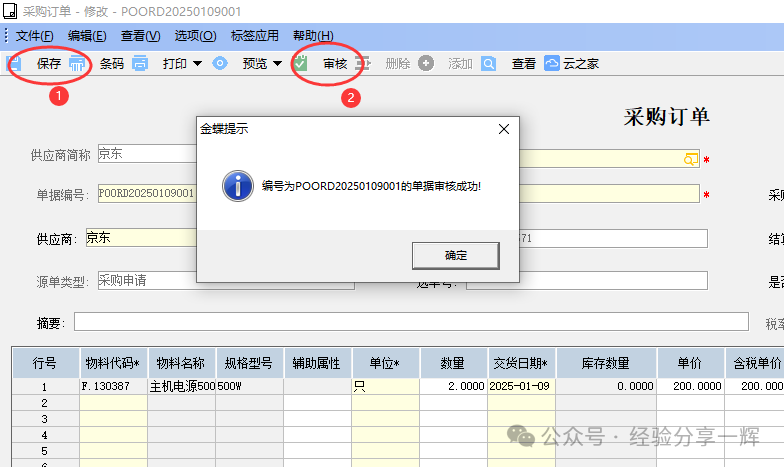 下推生成的采购订单有一个好处理,自动关联单据,我们要填写几个关键选键选项,供应商选择(京东),选择采购类型(国内买的选国内采购),填写价格(200),有黄色的为必填项。