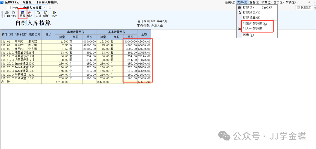 - 核算内容:自制入库核算处理的是本期未关联生产任务单的产品入库单。 - 核算步骤:打开产品入库核算界面,将自制品的成本单价或金额填到对应的列后,点击左上角的“核算”,系统就会将单价反填到产品入库单里的单价列。该操作在右上角菜单栏【文件】里可以进行数据导入导出操作。