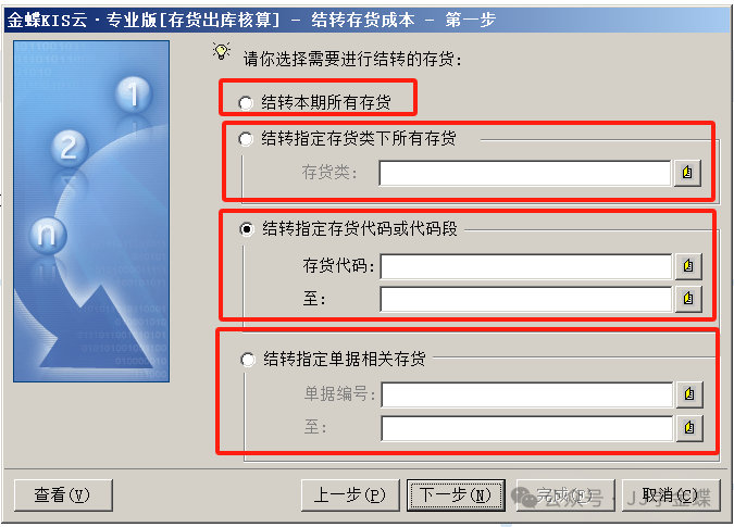 - 核算步骤: - 点击“下一步”,分别可以结转本期所有存货的成本、指定存货类、指定存货代码段和指定单据。省事点直接选择“结转本期所有存货”。