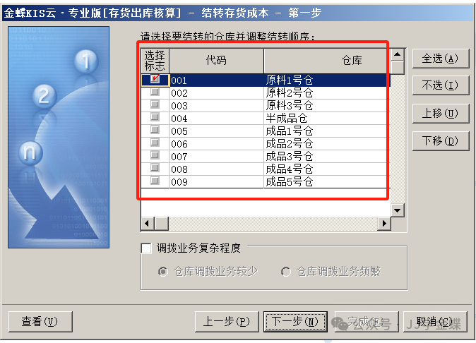 - 再点击“下一步”,进入选择仓库页面,选择仓库后再点击“下一步”(存货核算方式为分仓核算才有仓库选项)。