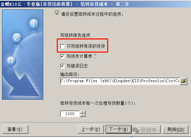 - 继续点击“下一步”,设置写结转报告选项,物料比较多的情况下建议勾选“只写结转有误的存货”。