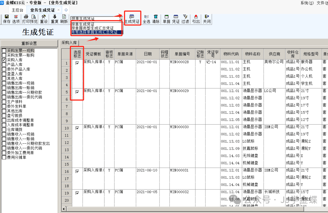 在打开的凭证模板界面,左边选择对应的事务类型,在右边空白处单击,再到左上角点击“新增”,在弹出的新增窗口将凭证模板填完整。需要用到的单据事务类型都要设置对应的模板,系统已经预设好通用模板。 - 凭证生成步骤:进入业务凭证生成界面,左边选择事务类型,点击“重设”,在弹出的过滤窗口中根据情况筛选出单据,勾选单据并选择单据生成凭证的方式然后点击“生成凭证”。