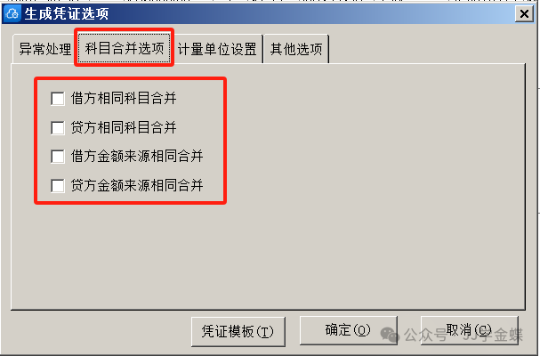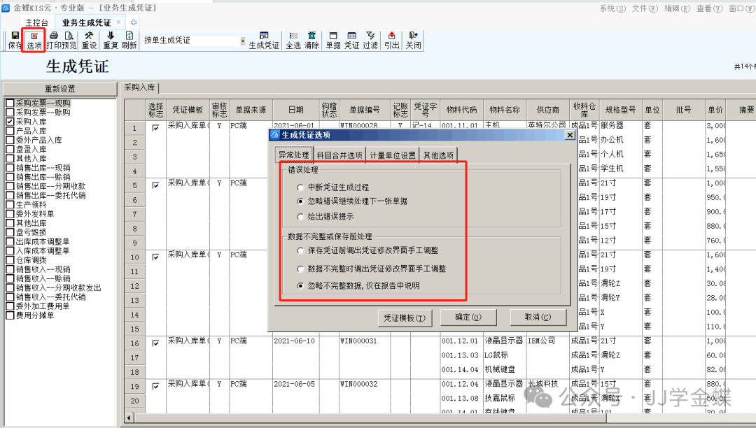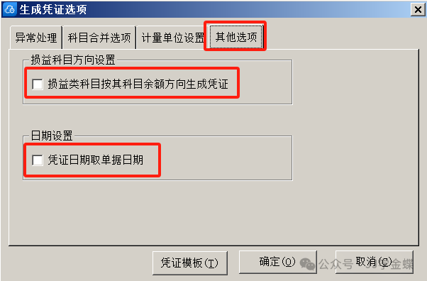 - 生成失败处理:在生成凭证时,若出现失败的情况,可查看报告。选项中有生成凭证的一些设置,可以设置生成凭证出错时的处理方法以及合并生成凭证的依据。