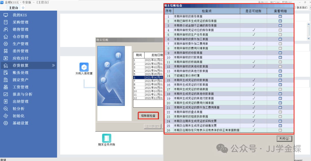 期末结账:进入期末结账界面后,点按“查看”按钮,先查看本期有没有不符合要求的上述现象,如有,请处理完毕后再进行结账。如果没有,则按“下一步”,系统会进行期末处理。如果不正确,请查看错误提示,如果正确,则系统会提示成功,状态栏中的会计期间会自动更新成新的会计期间。