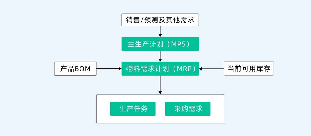 四、那到底该怎么配合使用? 我们前面说了,MPS 定节奏,APS 控执行,两者不是“选一个”,而是“搭着用、一起跑”。 那到底怎么配合? 一句话: 上层 MPS 把方向排明白,下层 APS 把资源安排清楚,中间用 MRP 拉通物料流,三者一起才能跑得稳、排得准、供得上。 下面我们按实际流程,给你拆个五步闭环打法,一步步对上号。 Step 1:先用 MPS 定“产什么、产多少、什么时候产” MPS 是大方向,就像你先定一个出差计划: 我要去哪里? 几号出发? 住几晚? 在企业里,MPS 就是: 哪些产品需要生产?(订单+预测) 每周生产多少?(按周定量) 有没有资源能满足?(粗略产能评估)