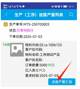 :ERP工序汇报按开始计时汇报操作指引![]() ERP如何进行开始计时-汇报结束操作? 操作步骤: 打开点晴业务通APP,点击"生产(工序)进度产量列表",进入界面后,如下图所示: