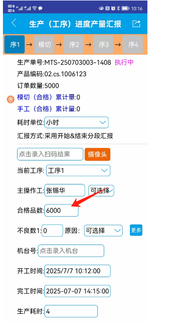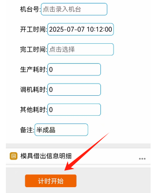 注意:开始计时汇报,无需填写数量,机台等信息 操作完后,等工序完成,重复操作上述步骤再次进入界面
