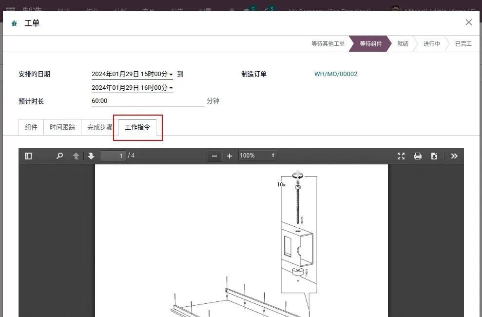 工单(WO):工单发布给车间的工人,描述了制造物品所需的具体任务。工单通常还包含生产地点、相关成本和制造活动预期持续时间的信息: