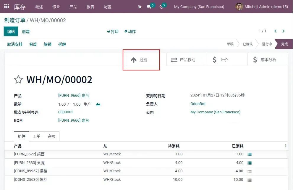 当准备好制造产品时,物料批次和序列号用于编制物料清单中的必要组件,并从仓库转移到生产车间进行生产。一旦产品完成,就会有一份记录显示所使用的确切零件。更复杂的制造方法也可以配置为需要拣取组件,然后存储产品。无论用何种方法,物料的移动都是透明的,可以通过追溯报告查看: