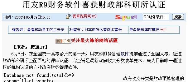 发布时间:2012-05-20 21:58:00 来源:软件服务社 前几天我们针对一些朋友的疑问,写了“财务软件是不是必须经过政府审批?”,很多用户看完后没什么疑问了。但没过几天,有人发来一个链接,说我们在上海的朋友肖中华他们公司的用户也有在问这个事情的,最后他们解释得口干舌燥,只好说:“不需要。信不信由你,反正我信啦”。 但很多人仍然在疑惑该信还是不信:如果不需要,为什么很多人有印象看到过某些软件宣传有财政部认证?就象您说:“世界上没有鬼,信不信由你,反正我信啦”,但有人就是说他见鬼了,怎么办?最好的办法就是把所谓的鬼抓来让他亲眼看看。所以,我们就想看看现在到底还有谁在扯自己的软件是财政部认证的。我们google搜了一下“财务软件 财政部认证”,看到网上确有很多人在问财务软件是否需要认证,很多回答完全不着边,可见这种所谓认证、审批之类的宣传真的害人不浅。但真正搜到的、宣传说某个财务软件通过财政部认证的文章,只看到二三篇,但与企业财务软件都完全没有任何关系:比如下面是6年前的一篇(http://it.sohu.com/20060609/n243651692.shtml,网页上都长满荒草、满是乱码了)。这是关于用友“政”务公司做的针对行政事业单位的一个产品(号称“专业政府财务管理软件”):