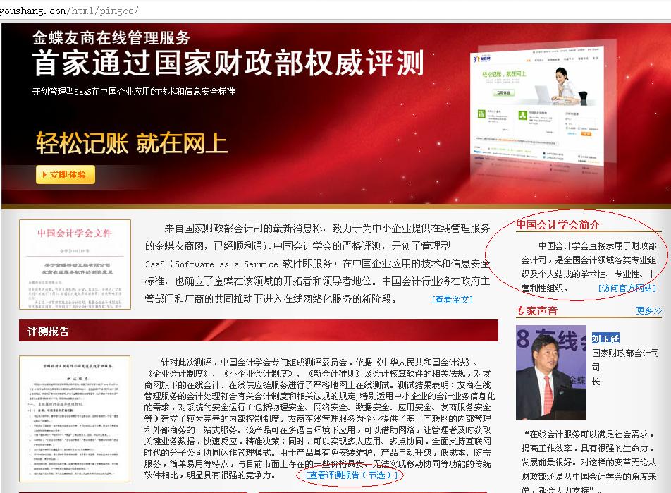 这些都是“政府内部”使用财务软件时所做的一个内部认证,就象您企业内选软件时,您自己公司的IT部也可以按本企业的标准对投标的各个软件做个认证一样。 这些认证与“企业”没有任何关系,所以我们又在浩瀚的信息海洋中搜索,还真看到一个号称是财政部认证的——金蝶友商财务软件。很多年前听说过,友商是金蝶花了很少一点钱收购的在线记账的一个小软件,这几年SaaS时髦后,金蝶逐渐增加了推广力度。该网站显示(http://www.youshang.com/accounting/):