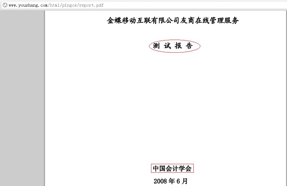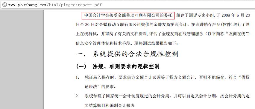 其中第二条是:“本会是由全国会计领域各类专业组织及个人自愿结成的学术性、专业性、非营利性社会组织”,这明确了它是一个社会组织而不是政府机构;唯一提到财政部的第四条只是说“本会接受财政部和民政部的业务指导、监督和管理”,这句话意思也很清楚:中国会计学会由于专业方向,因此“接受财政部的业务指导、监督和管理”是很正常的,但并不是隶属于财政部,更不能代表财政部。实际上,在中国,任何社团组织都要接受民政部的业务指导、监督和管理,但能因此说任何一个社团组织就能代表民政部吗?简直荒唐。 另外,这个报告第一段就写着是“中国会计学会接受金蝶互联有限公司的委托”,而不是受财政部委托,也说是说,连委托都不涉及,所以,这个报告更是与财政部没有半点关系。至于网站上列出官员、专家的图片和讲话,用意与“中国会计学会直接隶属于财政部”这个说法一样,就是想把不相关的说成相关的,以便引导人们相信这个报告既是官方的、又是权威的。 这就象以前经常有某些企业找某个大学某个系某个教研组的某个专家给做认个评审,就说是通过了某大学的认证,这还不算离谱,但不能借此说因为该大学属于教育部管,所以就成了通过教育部认证,更不能说教育部归国务院管,就成了通过国务院认证。如果这样的说话,干脆以后直接找老李做认证就行了,老李认证通过了,您就说老李归中华人民共和国政府管,因此通过了中国政府的认证,这可比通过XX部认证牛叉多了;或者从另一条线上联系:胡主席和习副主席是老李的同校学长,习副主席还是同一个系的,老李归他们管理,于是就成了他们认证通过了,这同样比只找几个专家认证牛叉多了。 二、这个报告是“认证”吗?不是! 这个报告封面上就已经写得很清楚,这只是一个“测试报告”。倒退一万步,即使写上“认证”二个字,也没有用,企业自己内部还可以做各种认证呢。而且,这个报告与财政部无关——因为财政部早已取消了财务软件的认证了。 至于上图中刘玉廷司长的讲话,讲的只是:“在线会计服务可以满足社会需求,提高工作效率,具有很强的生命力,发展前景很好。对这样的变革无论从财政部还是从中国会计学会的角度来说,都会大力支持”。他说得很对啊,政府这样做当然是好事。但是,哪句话提到“通过财政部认证”了?金蝶拿这个讲话来误导用户,玩弄领导没有这么玩的,有点玩过了。 三、这个报告专业吗、可靠吗?不是! 老李以前从来没有关注过这种认证或评审报告,以前在大学里工作过,知道这些所谓认证、评审都是怎么回事。这次没办法,只能看看,但除了封面和目录,就只有不到三页了,而且实在没什么可看的,比如都是些“凭证录入保存时,要求借方金额合计必须等于贷方金额合计”之类的。实际上,您要知道,这种所谓评审,每份报告只是对报告中的内容负责。所以这份报告只不过证明这个软件符合这些要求而己。这么简单得不能再简单的东西,也需要认证、评审?不觉得丢人吗? 耐心看到最后一句话,真的看到有技术含量、老李看不懂的:
