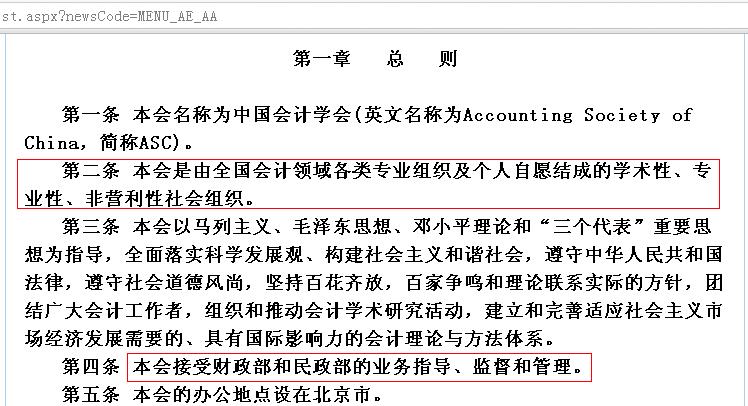 可以看到:封面上明确写着“中国会计学会”,正文第一段明确写着是“中国会计学会接受金蝶互联有限公司的委托……”,通篇报告中都看不到任何“受财政部委托”的文字,这事与财政部哪有什么关系?怎么就说成是财政部的认证了呢?这一点他们玩得很有技巧:在前面那个网页右侧的“中国会计学会简介”中,特别写着:“中国会计学会直接隶属于财政部会计司……”,也就是说中国会计学会是归财政部管的,这样就很容易让人们相信这个报告就“相当于”财政部的认证。但这是很可笑的,因为中国会计学会是一个独立的“社会组织”,并不是财政部下面的某个司或某个部门,它只能代表自己,不能代表财政部。您可以看一下中国会计学会的章程(http://www.asc.net.cn/Pages/News/NewsList.aspx?newsCode=MENU_AE_AA),“总则”部分写得很清楚: