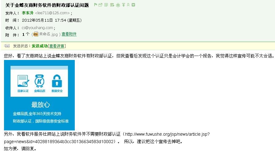 MID5加密是什么?以前记得MID好象是指类似于MP3、MP4之类的东西,莫非现在有了新的加密算法正好也叫这个名字?不至于啊,老李胆小,所以很多年前就对各种加密算法很关注,怎么就没听说这个算法呢?上网搜了一圈,看到MID的解释(来自百度百科): MID的基本解释有两种:一是指移动互联网设备,即Mobile Internet Devices;二是指midi的简称,MIDI是英语Music Instrument Digital Interface 的缩写,翻译过来就是“数字化乐器接口”。 还是与加密没有半点关系,过了几分钟,才想明白,肯定是把MD5写成MID5了!一共不到三页纸的“认证”报告,如果是笔误,那么这个“认证”也太不认真了吧?如果不是笔误,那么连MID5和MD5都搞不清,居然好意思写这个认证?不过,老李相信,这肯定不是不认真、不是笔误,而是连MD5这种最常用的加密算法是什么都搞不清楚,好好再学学数学吧。 不用再多说,您现在就可以知道,这份“认证”既不是“财政部”的,也没有什么意义。 本来,老李一贯遵守“人不犯我,我不犯人”的原则(可能是从小在部队被熏陶得根深蒂固了),本来不想写这个例子,因为和金蝶没有什么矛盾。但是他们这个所谓的“财政部”认证一是误导用户,二有影射其它产品没做认证之意。所以十天前老李本人非常认真地给他们发了个邮件(如下图),非常客气地请他们去掉这个宣传(其中还列上了我们上次写的那个说明,表明我们极度反感这种宣传):