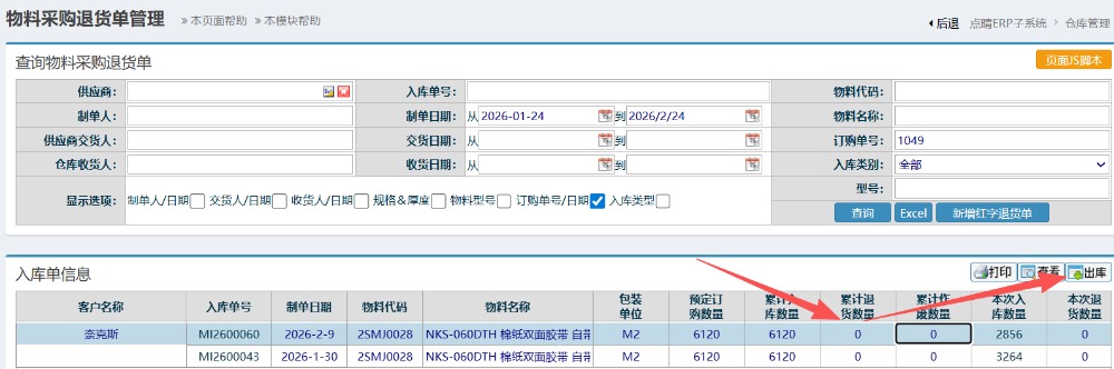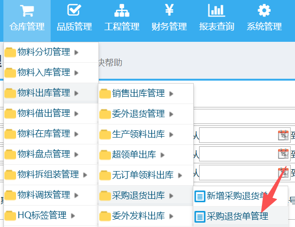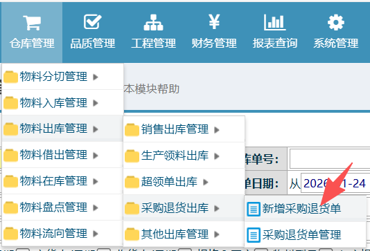 操作步骤:仓库管理-物料出库管理-采购退货出库-新增采购退货单
