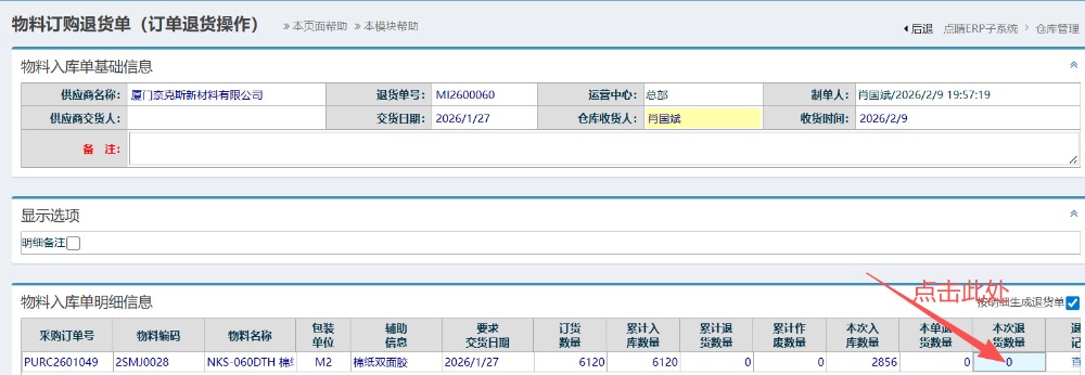 确定好数值后,点击采购退货确认,完成操作