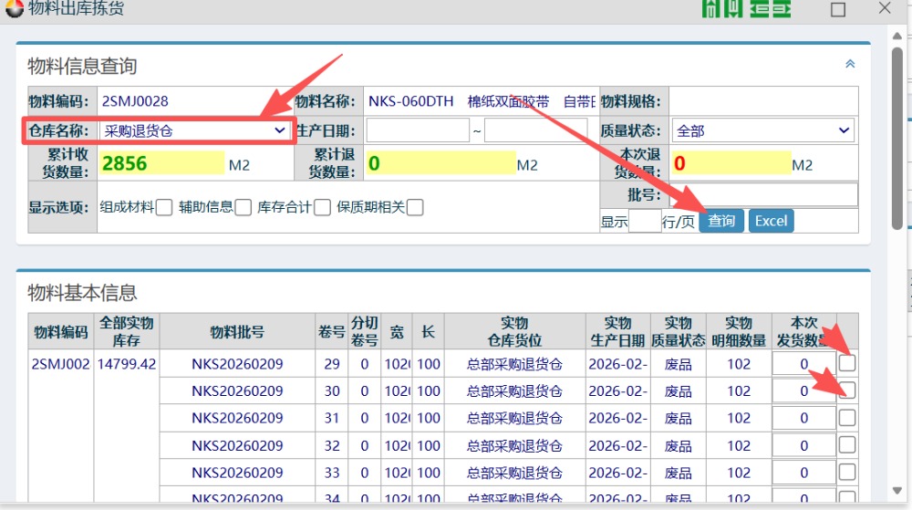 注意选择退货仓/不良仓进行查询
