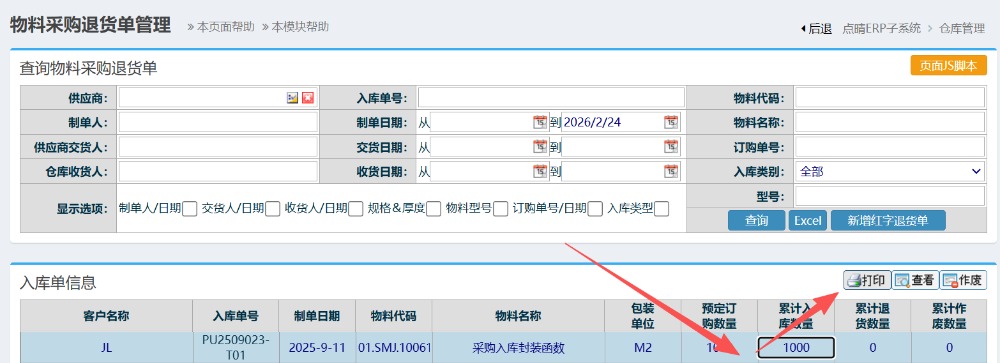 最后到采购退货单管理界面打印退货单,待供应商来取退货时作为签字交接
