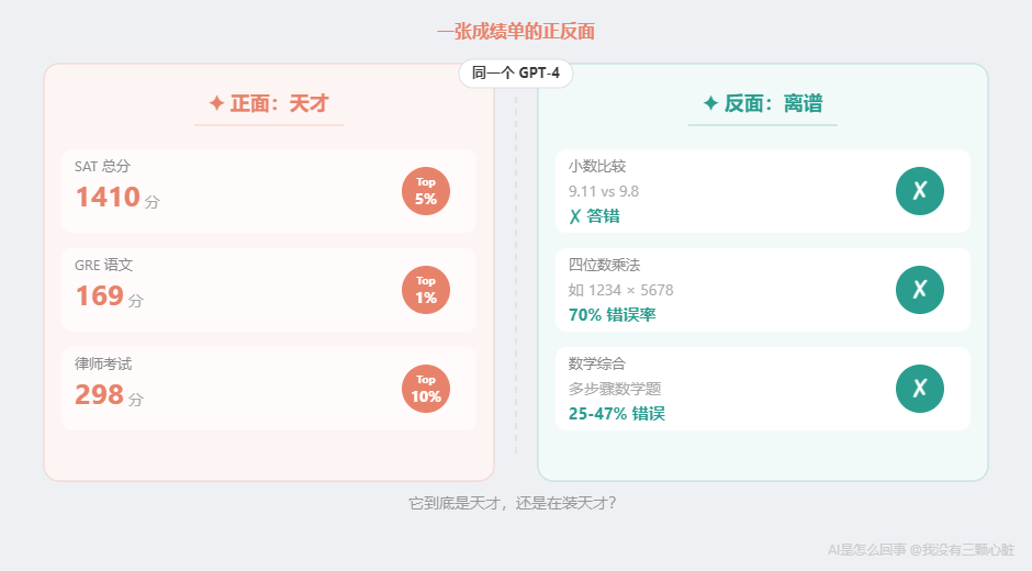 三年后,矛盾不但没消失,反而升级了——连研究 AI 的人自己也在为同一个问题争论不休:这些模型到底是真的在"推理",还是学会了更高级的"模式匹配"? 如果你觉得这个问题比三年前更难回答,恭喜——你看到了 2026 年 AI 领域最核心的困惑。 你用错了尺子这个问题之所以难回答,不是因为你对 AI 了解不够,而是因为「聪明还是不聪明」这个问题本身就是错的。 为什么你会觉得这组数据矛盾? 因为你在不自觉地做一个假设:「聪明」是一个统一的整体。 对人类来说,这个假设基本成立。一个能通过律师考试的人,不会连 9.11 和 9.8 都比不清楚。一个 GRE 语文 99 百分位的人,小学数学不会错。人类的各种认知能力之间有很强的关联性——语言能力强的人,逻辑能力通常也不差。心理学上叫这个"g 因子"——一种贯穿所有认知任务的一般智力因素。 但 AI 不是这样。 AI 的"聪明"是碎片化的。 它在不同任务上的能力可以相差几个数量级——律师考试前 10%,同时连小数比大小都会搞错。这两件事在 AI 身上同时成立,没有任何矛盾。 为什么?因为 AI 的每一项能力,都是从那个特定领域的训练数据中学来的。律师考试的能力来自海量法律文本中的问答模式。小数比较的"能力"来自——这个我们下面说。 用「聪明不聪明」来评价 AI,就像用「高不高」来描述一条河。 一条河有的地方深不见底,有的地方你能蹚过去。说它"深"或"浅"都不对——你得说"在哪个位置有多深"。 AI 也一样。你不能问"AI 聪明吗"。你得问"AI 在这个具体任务上有多强"。 2026 年的数据让这个特征更加鲜明——像一个数学竞赛满分、但换个数字就做错的学生。不是偶尔失误,而是结构性地:某些维度强到超越人类专家,某些维度弱到让人匪夷所思。