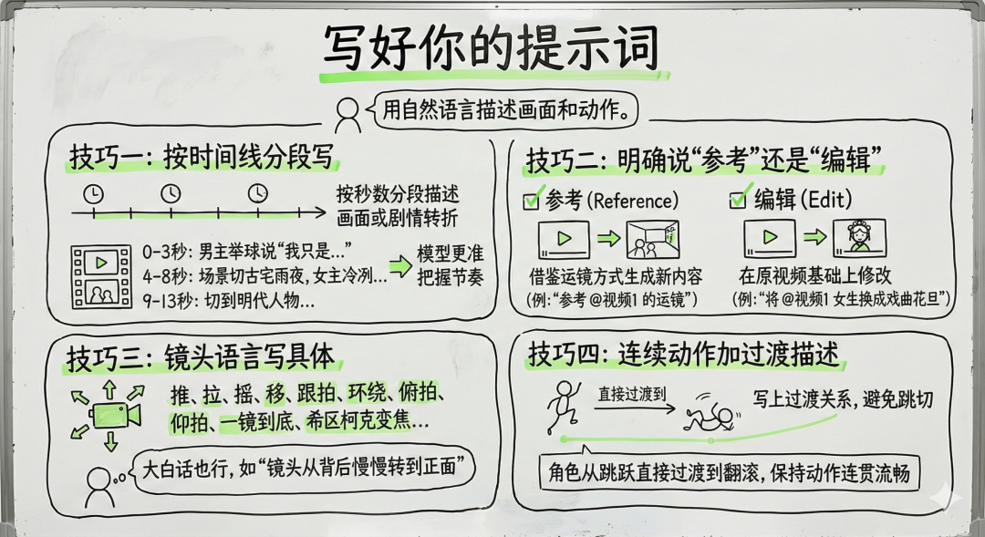 技巧一:按时间线分段写。 如果视频里有多个画面或剧情转折,建议按秒数分段描述。 比如: 0-3秒画面:男主手里举起一个篮球,抬头望向镜头,说"我只是想喝杯酒,该不会要穿越了吧……" 4-8秒画面:镜头突然剧烈晃动,场景切换成古宅的雨夜,一个穿着古装的女主冷冽地望向镜头方向。 9-13秒画面:镜头切到一个穿着明代服饰的人物…… 这样写模型能更准确地把握每段画面的节奏和内容。 技巧二:明确说"参考"还是"编辑"。 这两个概念不一样。"参考 @视频1 的运镜"意思是借鉴它的镜头运动方式来生成新内容;"将 @视频1 中的女生换成戏曲花旦"意思是在原视频基础上做修改。写清楚,模型才能正确响应。 技巧三:镜头语言写具体。 不用怕写多,模型现在的理解能力很强。推、拉、摇、移、跟拍、环绕、俯拍、仰拍、一镜到底、希区柯克变焦、鱼眼镜头……这些专业术语它都认识。不懂术语也没关系,用大白话描述也行,比如"镜头从背后慢慢转到正面"。 技巧四:连续动作加过渡描述。 如果你想让角色做一系列连贯动作,记得写上过渡关系,比如"角色从跳跃直接过渡到翻滚,保持动作连贯流畅",避免画面出现不自然的跳切。 第五步:选择生成时长,点击生成在 4 到 15 秒之间选一个你需要的时长。