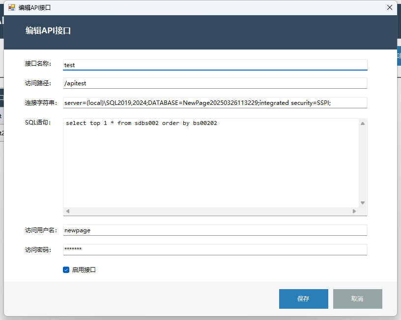 启用接口:勾选该选项后,接口方可被正常调用;未勾选则接口处于禁用状态,无法访问。