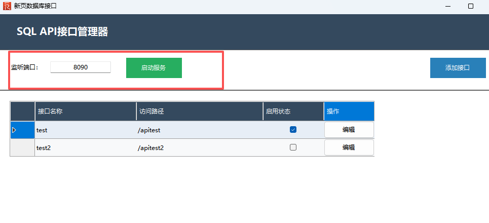 打开工具:启动 “数据库接口” 工具,进入接口配置主界面,界面将展示监听端口、启动服务、添加接口等核心功能按钮,同时显示已配置接口的名称、访问路径、启用状态及编辑操作项。
