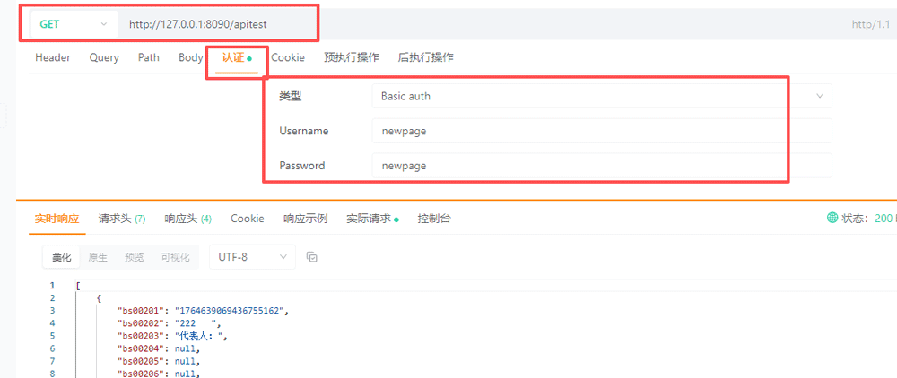 身份验证:采用Basic auth验证方式,在请求头中输入第二步配置的接口访问用户名和密码,完成身份校验;