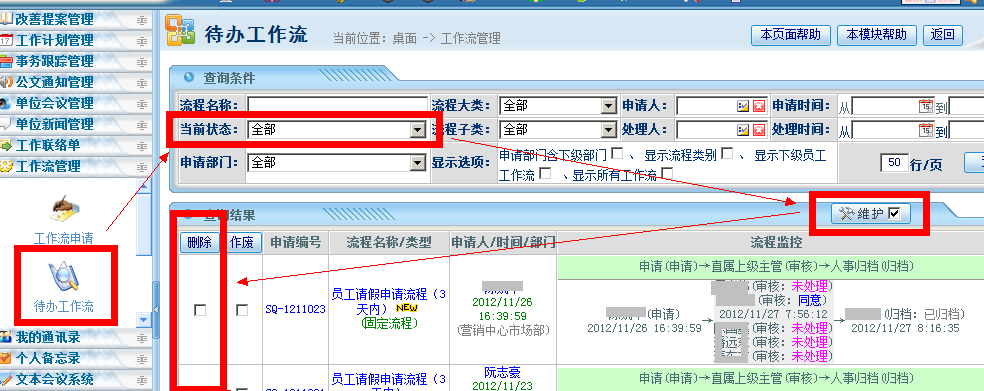 :一条请假申请流程下来,领导审批后,归档人归档后,发现与实际情况不符合,要删除这条请假记录,目前系统在待办工作流有一个作废功能,可是用了作废后,归档人在人力资源管理中统计所有申请信息的时候,这条记录依然存在,这要怎么办啊?