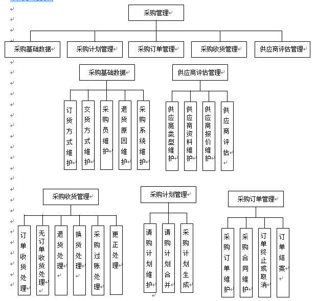 采购系统模块: 采购管理:采购订单管理、采购收货管理、供应商评估管理、采购基础数据、采购计划管理 1、采购计划管理: 请购计划维护、采购计划生成、请购计划合并 2、采购收货管理: 更正处理、采购过账处理、换货处理、订单收货处理、退货处理、无订单收货处理 3、采购基础数据: 订货方式维护、退货原因维护、采购系统维护、交货方式维护、采购员维护 4、采购订单管理: 订单结案、采购订单维护、订单终止或取消、采购合同维护 5、供应商评估管理: 供应商类型维护、供应商报价维护、供应商资料维护、供应商评估