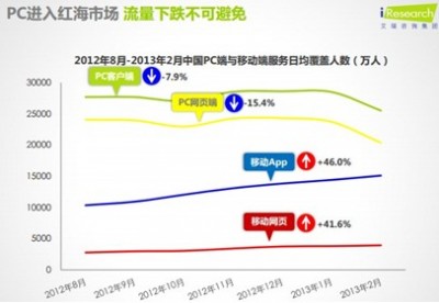 据艾瑞网发布的《移动互联网引爆未来》的报告中显示,2012年8月——2013年2月中国PC端与移动端服务日均覆盖人数比对,PC客户端下降7.9%,PC网页端下降15.4%,移动APP上升46.0%,移动网页上升41.6%。