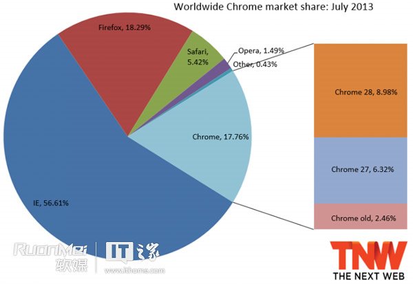 Chrome则是7月份表现最好的浏览器,总份额达到17.76%;刚发布不久的Chrome 28份额已达到8.98%。