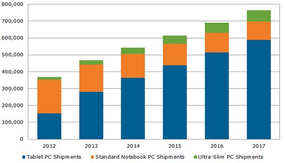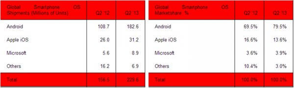 对比两张图标不难发现,无论是在智能手机还是平板方面在这一年间都出现了基本一致的局面,Android设备出货大增,市场占有率也随之水涨船高,而iOS设备出货相对平稳,但不进则退,份额已被稀释。至于Windows家族的移动设备,则只能独守自己的一亩三分地。残酷的是,留给其他系统的机会已经很小了,在这个两个业已相对成熟的市场里,新生儿和年迈者怎能和几位筋肉人抗衡? 智能手机产业而经历了这几年的飞速发展,也该进入一个平缓期了,那么可以预见到,上述榜单的座次短时间内不会发生大的改变,甚至连份额变动的幅度都不会很大。尤其是智能手机份额在手机整体领域的份额已经很高了,另一方面高端智能手机市场已经快接近饱和了,Android份额已经快到峰顶了。预计本年度发布的iPhone 5S(6)和“廉价版”iPhone也会给Android手机带来冲击。 平板电脑的发展则依旧会进行下去,各厂商除了在智能手机市场上守住江山外,平板的发展战略也至关重要。