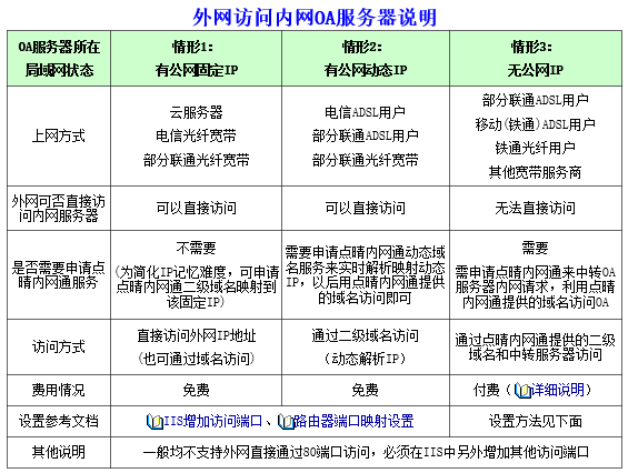 OA服务器所在 局域网状态 | 情形1: 有公网固定IP | 情形2: 有公网动态IP | 情形3: 无公网IP |