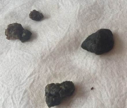 第二次肝脏清洗出来的结石,有一些是黑色的,说明它的年数已久。越老的结石颜色越深,越年轻的结石颜色越绿。