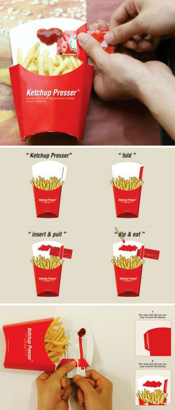 ▋创意面条碗 ▋创意番茄酱包设计 再也不担心番茄酱粘到受伤了 ▋蝴蝶茶包 蝴蝶茶包(Blooming Tea),茶包挂绳的另一头是纸做的蝴蝶,泡茶的时候,这蝴蝶可以卡在茶杯边沿上,像挂钩一样把茶包线挂住,方便处理茶包,又增加美感。 ▋自动封口的垃圾桶 它就像我们超市里使用的自封口一样,只要用力把袋口向下一压就可以了,非常的方便,但是却给我们的环卫工人带来工作上轻松一点。 ▋小鸟瓶夹 瓶盖上是一只小鸟的轮廓,替换掉矿泉水瓶上的盖子,即可挂在包上随身携带。 ▋隐形高跟鞋 只要轻轻摁一下按钮,就可以将高跟鞋变成平底鞋,MM们开车、骑车、跳舞、走路都没有烦恼了。 ▋热饮冷饮充电杯垫 看上去像是一块金属杯垫,它的特色不需要任何外接电源,只需一杯热饮或冷饮就能帮手机充电。采用两面式设计,红色面可以把热能转换成电力,待指示灯号亮起,可通过USB连接线来帮手机、平板来充电。把冰凉的可乐或啤酒放在蓝色的那一面上,也可把低温转换成电力来充电。