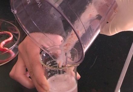 这黄鳝里那么多虫子哪里来的?吃进胃里会怎样?对人体有危害吗? 来吧,实验走起! 黄鳝的这些寄生虫能被我们的胃液杀死吗? 就在那个农贸市场,实验君一口气买了10斤黄鳝,老板说都是养殖的。 首先我要模拟一个黄鳝被咀嚼后进入胃里再被胃液消化的过程。 先把黄鳝的肌肉和内脏分别加入清水,然后用搅拌机充分打碎,(这是模拟咀嚼的过程)然后用跟人体胃液的成分几乎一样的消化液(包含胃蛋白酶、氯化钠、稀盐酸和水)和黄鳝肉渣与内脏渣充分融合,模拟胃液的消化。
