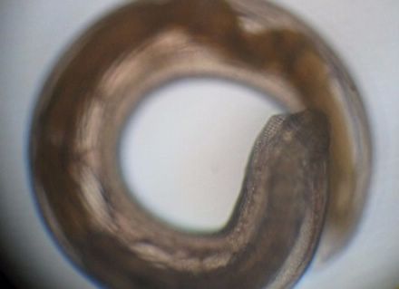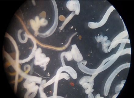 那这杯粉红色液体里到底有没有寄生虫呢? 实验君把它放在解剖镜下观察。我勒个苍天!一大片蠕动的虫子!透明的表皮,黄色和白色的身体,有的展开身子像蚯蚓一样游动,有的盘起来像螺蛳一样!可以想象这些家伙在我们的胃里会是什么样!