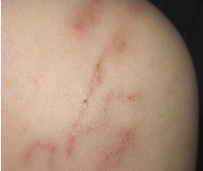 看到了吗?即使经过咀嚼、胃液消化4小时后,这种虫子仍然能在你体内存活! 那么,感染这种虫子后有什么症状呢? 杭州就有位女患者就因为吃黄鳝,染上了颚口线虫。这些红色的线条是虫子在人体皮肤下游走的痕迹。