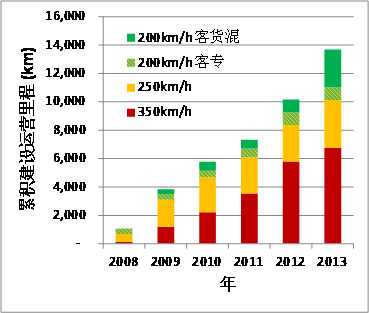 中国已建成一个总里程超过1万公里的高速铁路网 中国高铁低成本引人注目 截至2013年年末,中国已建成一个总里程超过1万公里的高速铁路网,远远超过世界上任何其他国家,也超过了整个欧盟地区的高铁网。而世界银行的最新研究论文称,除了里程惊人外,中国高铁的低成本也引人注目,至多只有其他国家的三分之二。 世界银行的报告按照国际通行标准,将高铁定义为最大速度为250 公里/小时及以上的铁路。按此定义,中国的高铁项目始于2003年,首条高铁为秦皇岛与沈阳之间404 公里的线路,最高时速为250 公里。2008年8月,北京至天津的高铁开始营运,成为首条时速350 公里的新一代高铁。截至2013年12月末,设计时速为200 公里及以上的铁路已贯穿或即将贯穿中国的大部分都市区。