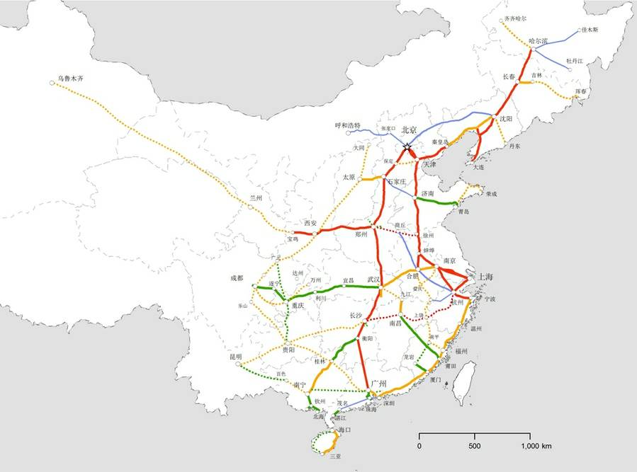 中国高铁网示意图(截止2013年底) 票价仅为其他国家的1/4到1/5 与建设成本相比,中国高铁的票价更是低的惊人。 根据现有中国铁路的列车时刻表(2014),繁忙线路上每天平均有70至100对高铁列车运行,而且在交通高峰期间,每小时多达8对列车。据估计,此类线路上的交通密度为两千万至三千万名乘客。 交通密度处于中等水平的线路,每天有40至50对列车运行。部分高铁列车仅在大城市停靠,而其他列车在中间城市也会停靠。 根据2014年1月《人民铁道报》的统计,高铁平均上座率为70%。时速200-250公里、300-350公里高铁二等座票价分别为0.28、0.48元/人公里。该价格为传统特快火车票价的三到四倍,但低于或与打折机票价格差不多,低端票价与城际巴士的费用相当。该票价与世界其他国家同等高铁票价相比,只有其四分之一到五分之一(根据官方旅行网站,法国每公里1.5-1.95元人民币;德国:约合2.11元人民币;日本:约合1.8-1.93元人民币)。