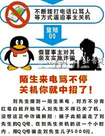 骗招八:陌生来电骂不停很可能是骗局 假如一陌生人来电,对方不分青红皂白就开骂,这时候,千万别关手机,把对方设为黑名单即可。因为这是骗子的诈骗新招,骗子同过来电辱骂不停,令对方反感进而关机,这是为了盗走受骗者 QQ 号,对其亲友进行敲诈行骗。 该文章在 2014/7/25 15:46:35 编辑过 |